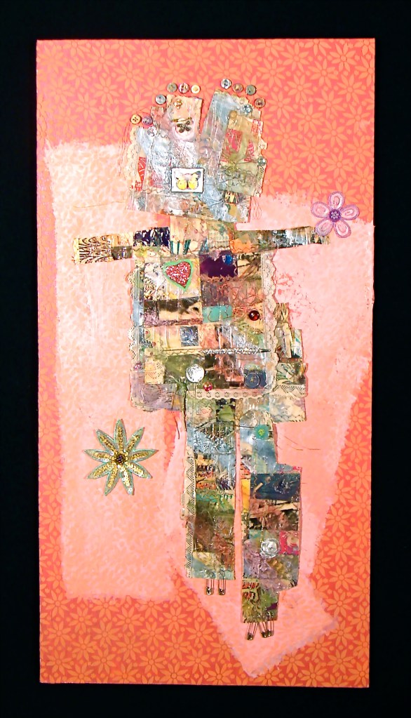 Published January 2, 2013 at 1313 × 2293 in Becky’s Art Happy Girl This one as actually made out of the left-over scraps from “Paper Quilt”, assembled into a doll shape and attached to fabric on a board. Like Loading...